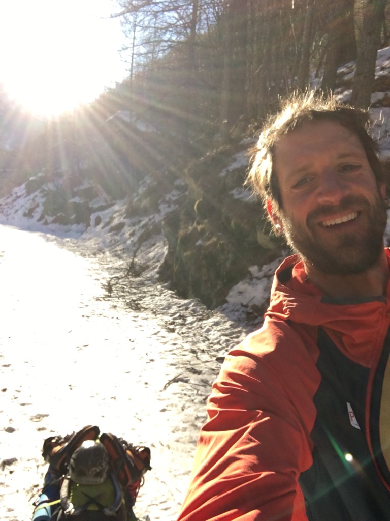 Pourtant je n ai pas été attardé par d autre rencontre , il n y a pas foule au glacier noir l hiver, c est l avantage des cinq heures d approche depuis Pelvoux…!😂Je remercie d ailleurs mes enfants pour le prêt de leur luge qui a fait une merveilleuse pulka . Bon après m être fait allègrement grillé par des vttistes assistés (oui oui on rencontre de tout en montagne, faut dire qu il y a 10km de route enneigée), je me suis demandé si j aurai pas dû lever le pouce. Il faut croire que mon barda les a quelque peu effrayés car ils ne m ont pas proposé de me prendre en croupe. La marche me laisse plonger dans mes pensées , et les trois « papa je veux pas que tu partes! » résonnent dans ma tête. Donc 5 heures de labeur plus tard me voici au pied de la face N du Pic sans nom et enfin mes turtupitudes à propos des conditions et donc de la tactique d ascension commencent à se dissiper: il y a 1,5 jour dimanche soir une Pertub est passée et a enneigé les savoies et même le nord des écrins : il a neigé à la Berarde à quelques kms de là et ici incroyable , point de cette matière glissante ! Merci à Sylvain qui a le visu sur les Ailefroides depuis chez lui et qui m en a fait part « je crois pas qu il y ait de neige fraîche ou alors qlq cm tout au plus » oui mais avec du vent, autant la face est plâtrée!…m étais je dis. Bref, je suis au pied de la face et bien rassuré à voir ces bastions rocheux secs. Enfin délesté de mon chargement (25kg), je vais préparer le lendemain en traçant l attaque et fixant L1, ça me prend trois heures, mais quel pied d enfin grimper dans cette face! En descendant en rappel jusque au dessus du relais, le friend complémentaire sur lequel je suis pendu lâche. Mon arrière train tombe pile sur une lame granitique bien contondante. Aie!