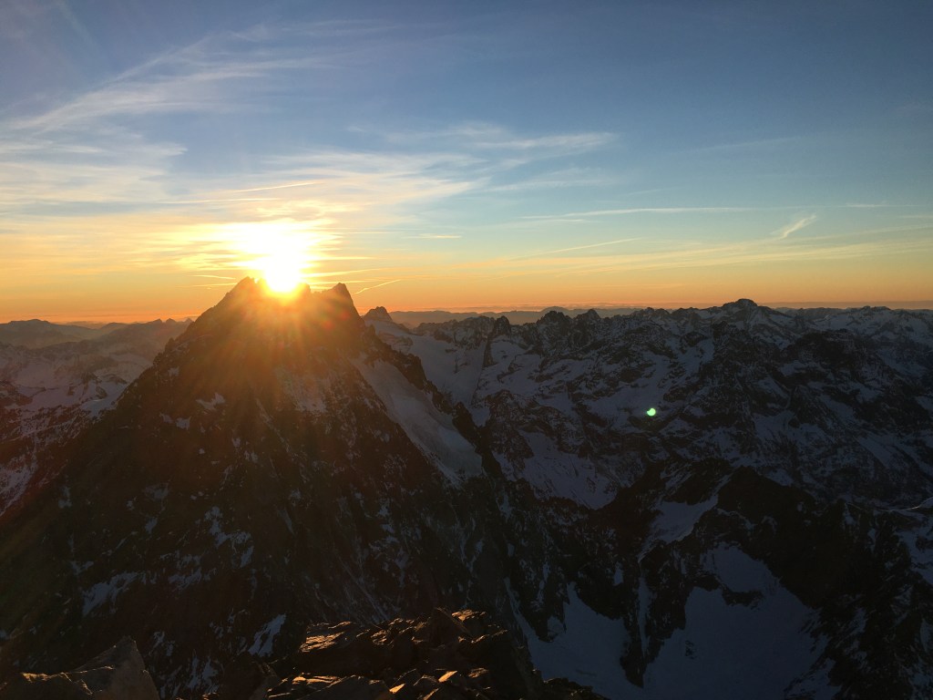 Bivouac sommaire sur un lit de fakir et que mon gros bleu n aide pas : les cailloux sont gelés et donc difficiles à terrasser. Mais néanmoins nuit assez longue pour la circonstance, j ai connu plus court! L heure du réveil est un compromis entre la durée du repos , le froid de la nuit, et la durée de grimpe potentielle à la frontale versus la difficulté des longueurs à venir. Bref, lever 2h30 et zou!Mes traces de la veille me permettent de finir ma nuit tranquillement, mais la barre d accès au névé finit de me réveiller totalement car ici c est solo, mixte et pas de dalle. Concentration totale.Je fixe mon Jumar sur ma corde fixe avec délectation ; voilà l échauffement physique maintenant! Suivent les 2 longueurs suivantes à la lueur de la frontale, et je me réjouis de mon repérage de la veille. Je trouve Le 6b/A1 pas très agréable, (écailles sonnant creux) et pas si facile: après trois pitons moyens dois je artifer sur friend ou tenter le libre? Ce sera un mixte des deux. Et la fin de la longueur est raide et athlétique avec de beaux pièges à friend, manque de chance tous les miens sont plus bas! Vu du haut la variante de Steph benoist a l air bien sympa à grimper en tout cas . Les premières lueurs me cueillent au relais de cette longueur, je me retourne et quel spectacle que la barre des écrins aux premiers rayons!L ambiance headwall est super, le caillou classe , le cheminement esthétique, what else?J alterne les passages avec la corde et sans. Mes grands chaussons acceptent deux chaussettes et j ai chaud au pied comme jamais en montagne, bon par contre niveau précision c est pas le pied justement mais je m adapte. Et côté main, l iso à 3500 a du bon , et j alterne gants et « mains nues ». Magnifique fissure diagonale pour finir les difficultés, et ça y est 12h30 le granite est derrière moi. Encore une longueur de 5 droit puis les crampons sont de mise. J’apprécie l affûtage de mes crampons tout neufs dans cette glace dure. Je chemine au mieux entre goulotte, rocher et mixte. Certains passages sont superbes. J arrive enfin à l arête terminale à l heure du goûter et j y retrouve mon copain le soleil : j en profite pour me faire fondre de la neige, la route est encore longue jusqu au bivouac . Encore de la concentration extrême sur cette arête rouge et raide, et dont les ressauts n en finissent pas: il faut louvoyer, chercher toujours le moins raide, pour finalement déboucher au sommet. Le soleil est encore là, il se couche sur les Ailefroides juste à côté. Émotion.