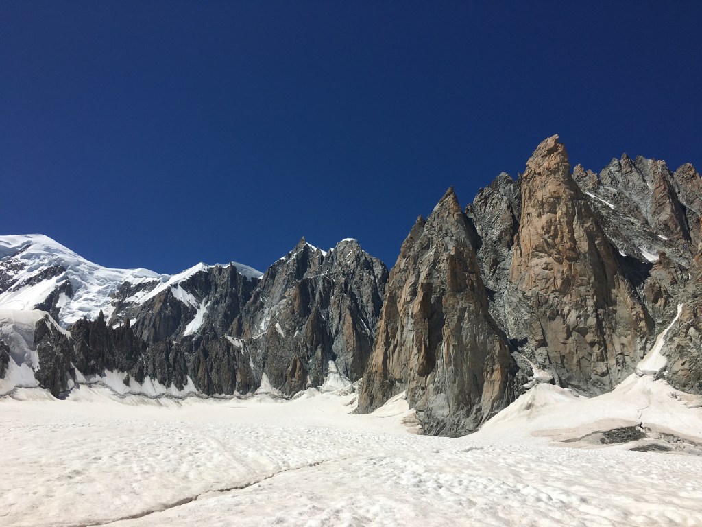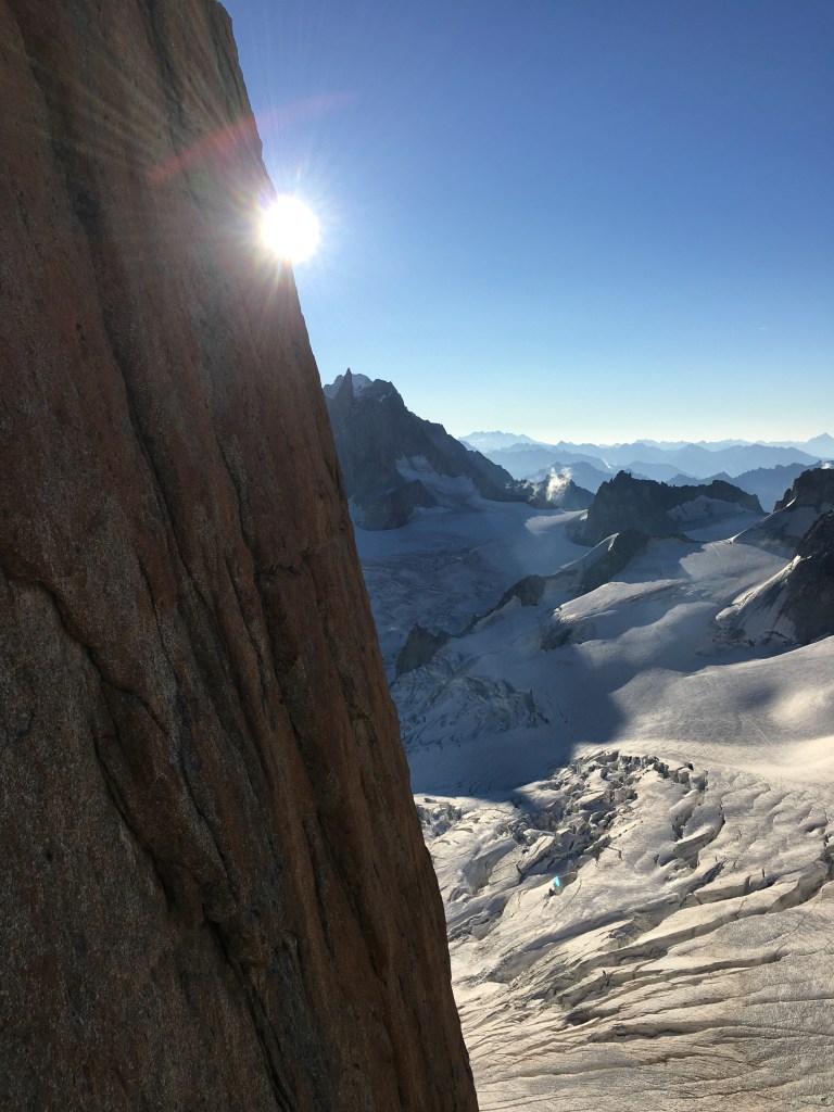 Romain rêve du grand capucin, c’est par une préparation progressive au fil du beau rocher chamoniard que nous nous dirigeons vers le fier pinacle. Les conditions sont bonnes. Et c’est avec émotion que Romain rejoint le sommet du grand capucin « c est le plus beau jour de ma vie! ».