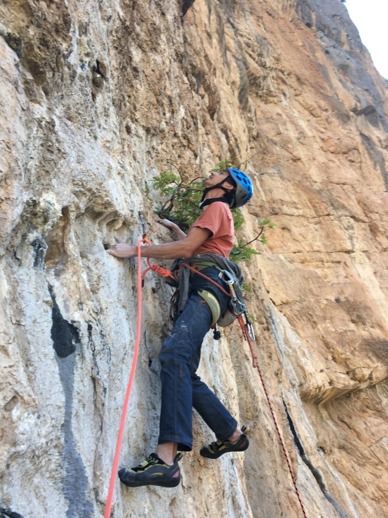 J2: jumar nocturne puis c est à notre Cordee Pierrick et moi de passer devant et laisser les paires aux copains. Chacun une pause au crux de L3 7b+, pour ma part en tête et rendue obligatoire par la corde de hissage coincée… pas mal de trav et cheminement sur trous, rien à jeter ! A la fin revenir au goujon de 12 à droite assez facilement, ça passe aussi droit par les 2 goujons de 10 de maso puis à droite.