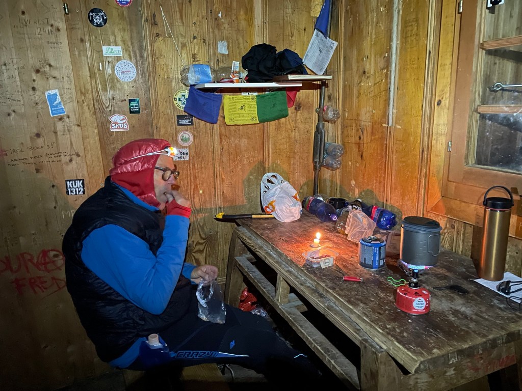 Inquiet quand je vois la neige pulvérulente en nord sous le refuge , puis rassuré par les traces sur le glacier. Puis finalement plus de trace mais place à l action!