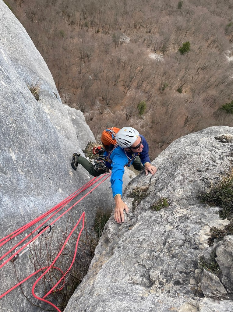 Le foehn se lève, c’est l’occasion de fêter le printemps dans la douceur d’une paroi plein Sud !… L’occasion aussi pour Bruno de se recaler sur la grimpe : dalle, renfougne, Artif, terrain chamois, tout y est!… En vue d’objectifs un peu plus haut !