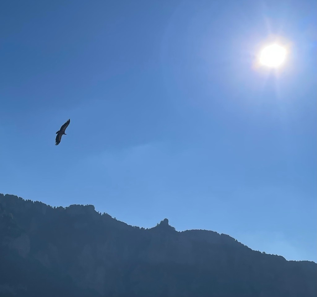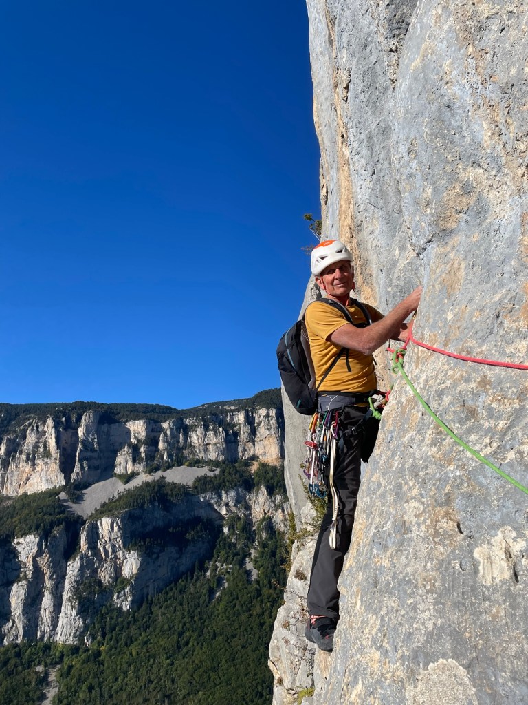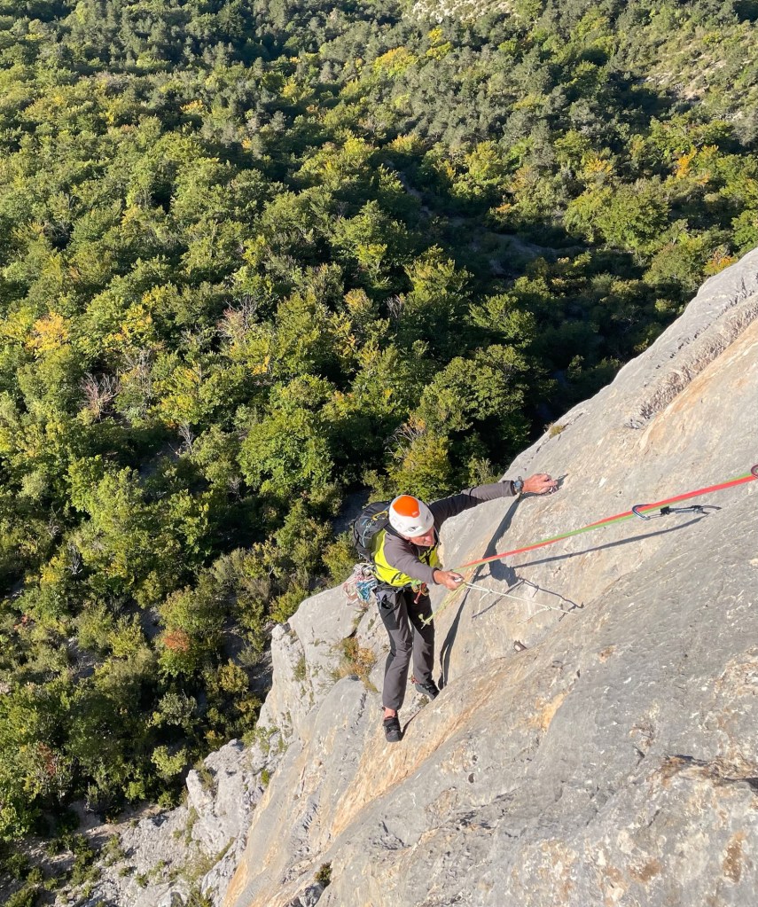 C’est une première pour notre cordée avec Jean Luc, une voie calcaire majeure des Préalpes ! Malgré l’âge qui avance, Jean Luc reste toujours motivé pour La grimpe, mais les côtés désagréables de la haute Montagne lui sont maintenant peut-être un peu trop désagréables justement ! donc nous avons choisi de l’escalade plaisir pour cette sortie. Le cirque d’Ariane est absolument magnifique et l’impression d’isolement n est troublé que Par les quelques vautours qui viennent nous rendre visite à la faveur des premiers thermiques. Au passage, félicitations au « Grec » pour cette voie astucieuse, variée et de caractère !