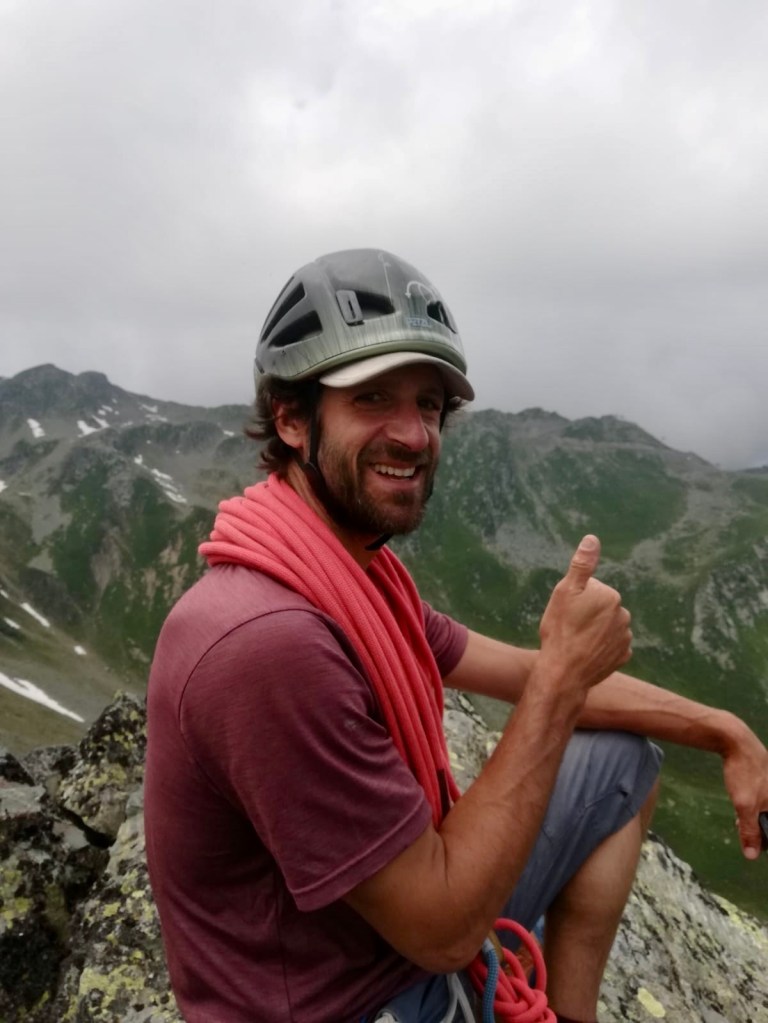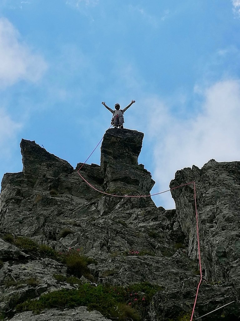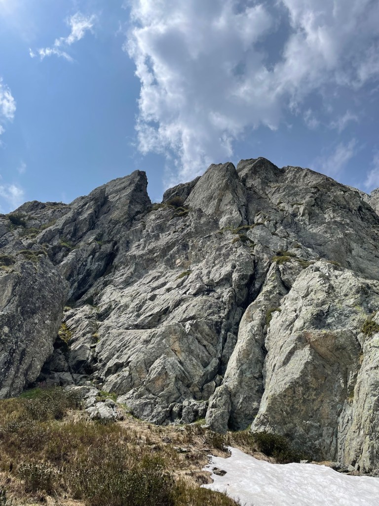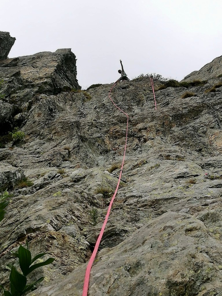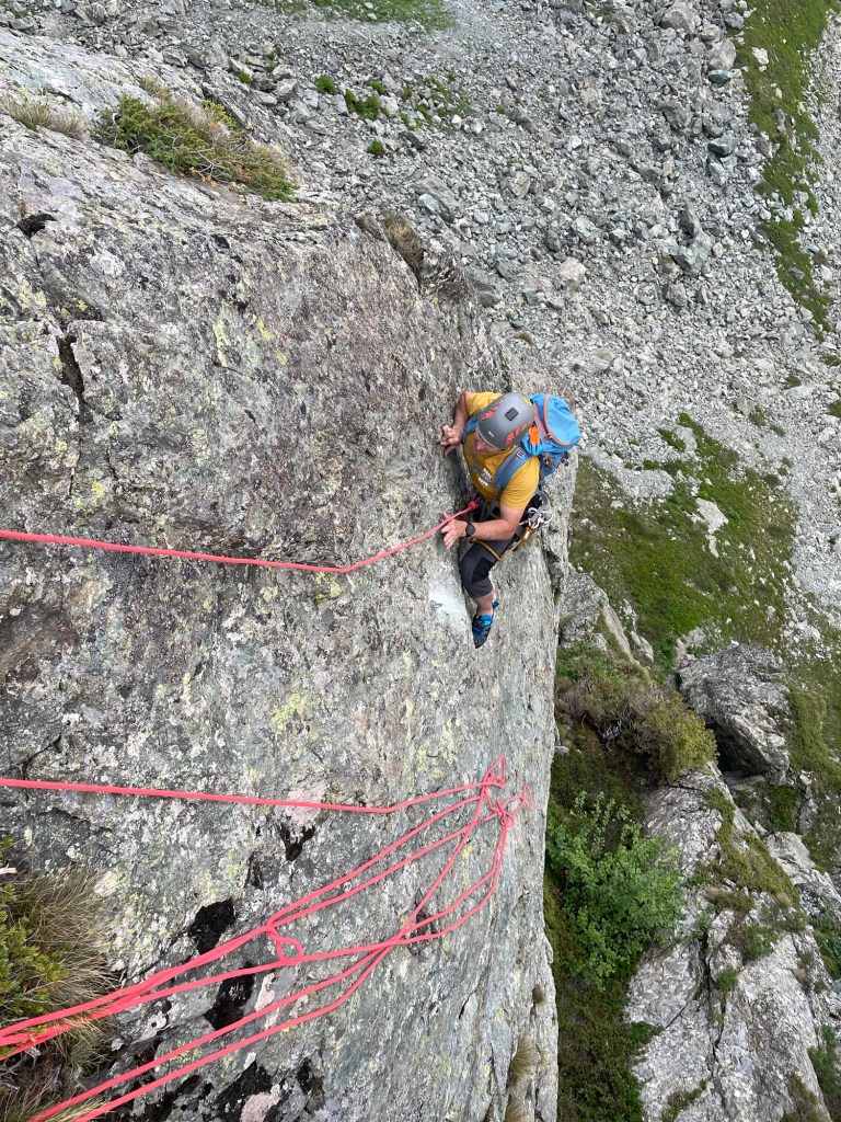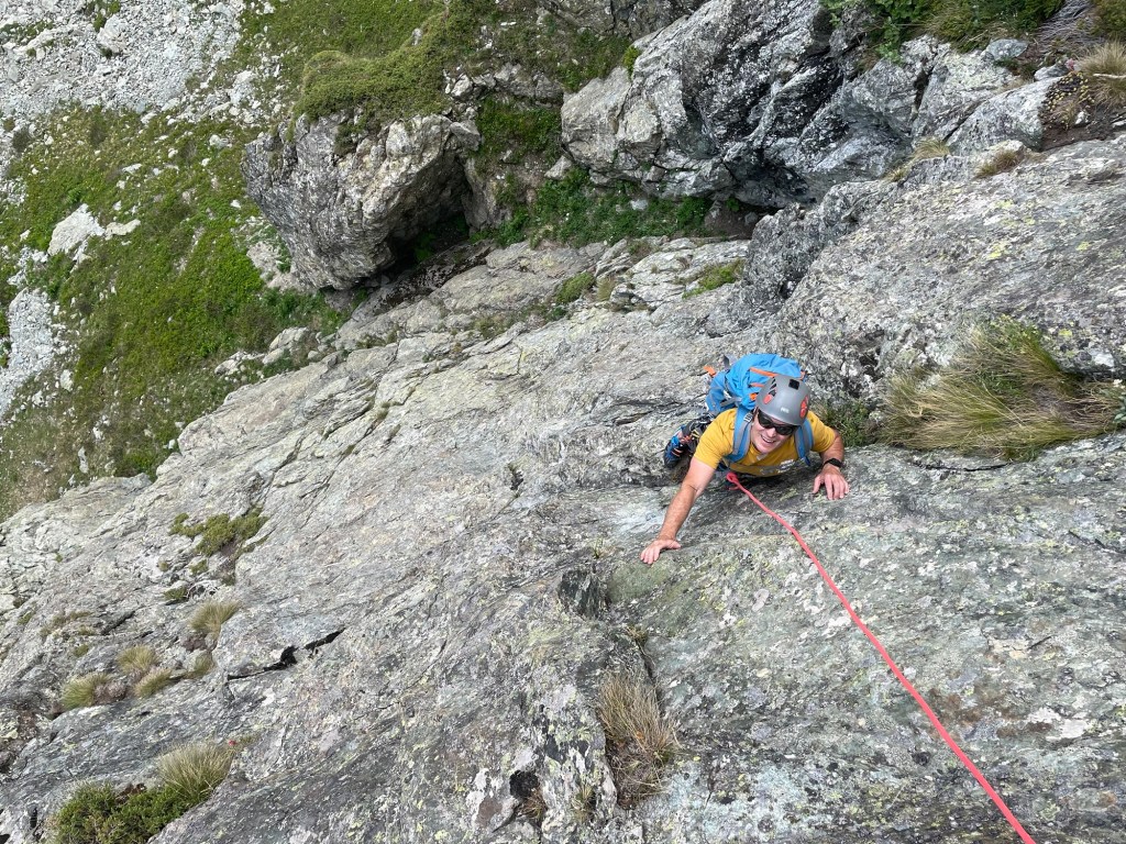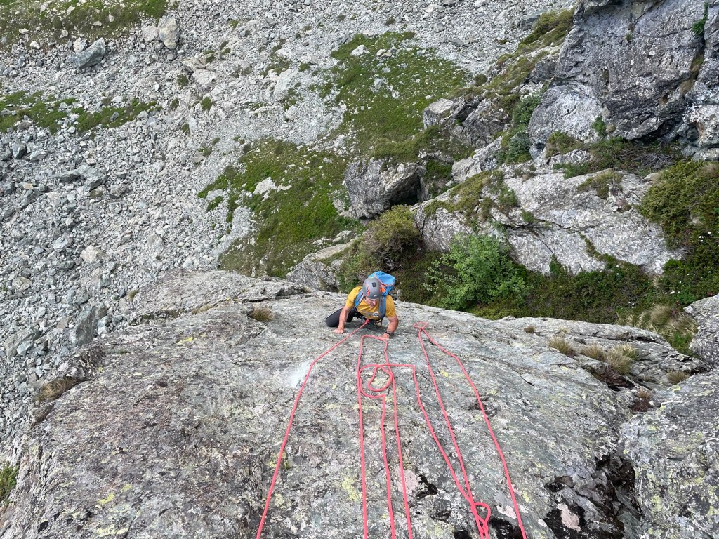 Côté matos, j ai skié avec des AlienRS Scarpa sur des Hannibal 96, légers et polyvalents en toute neige; 1 l d eau pour être léger (quitte à manger un peu de neige pour ne pas finir complètement déshydraté); pas de corde…mais de la désescalade a la place des rappels. 😅 ou du dry skiing pendu au Piolet parfois.