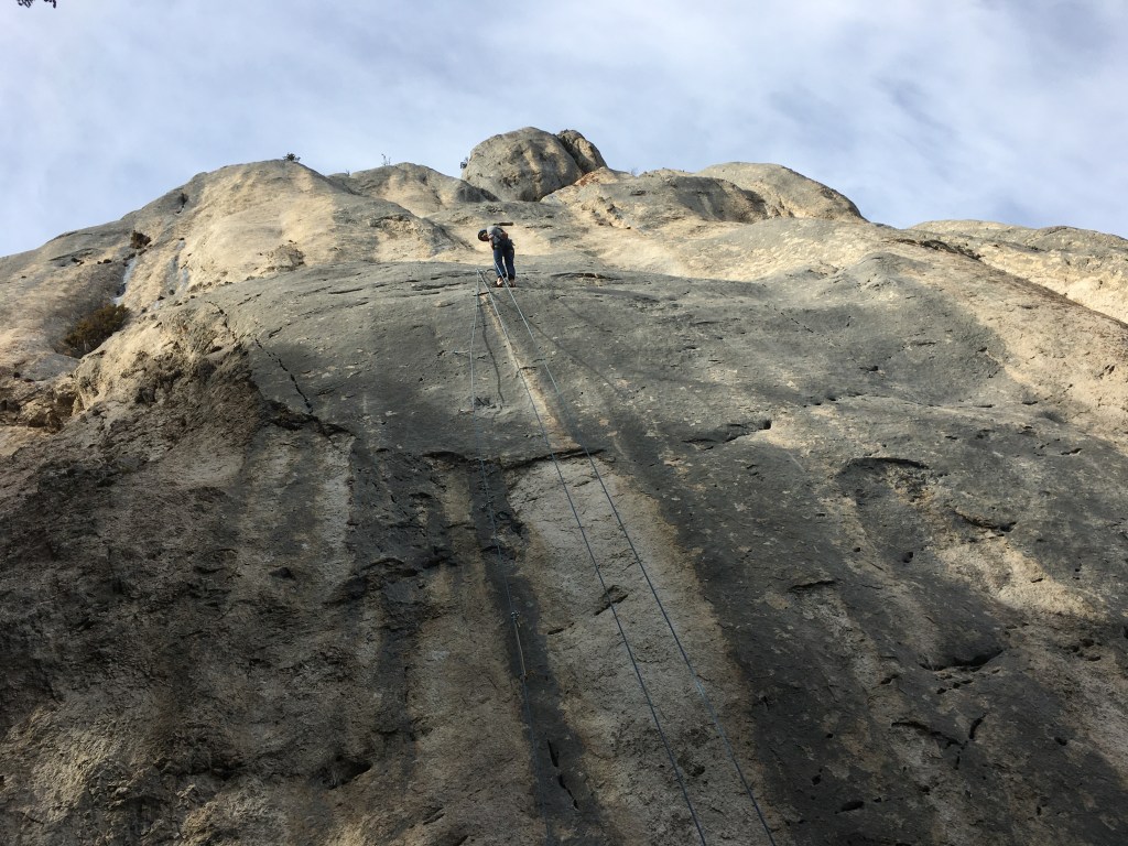 Encore quelques petites prises qui cassent ou qui croustillent, mais les passages devraient y remédier. Du caillou très classe sur plusieurs sections. La voie mérite largement une visite au même titre que les autres de la face est, et d un point de vue difficulté ça peut se voir comme 7b max et 2×2 point d aide dans les deux longueurs clé.