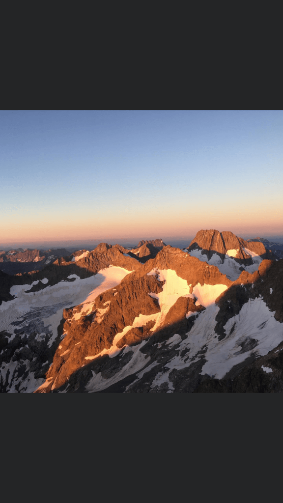 Une course qui a du chien, tout y est : headwall, dalles fissures, glace mixte arête.Une face qui a de la gueule. Un sommet qui … n a pas de nom😂 mais qui est mythique ! Un glacier qui est noir et où bat le cœur du massif. Je recommande donc!😊 Prévoir stoppers, un jeu de friend (jusque 2 ok) en doublant les tailles moyennes. Pris trois pitons mais pas utilisé. Broches. Horaires à titre indicatif : 3h30 glacier- 12h30 fin des difficultés – 16h pied de l arête – 18h sommet (y compris pause eau)- bivouac 22h. Soit environ 14h30 de grimpe et 3h30 de descente .